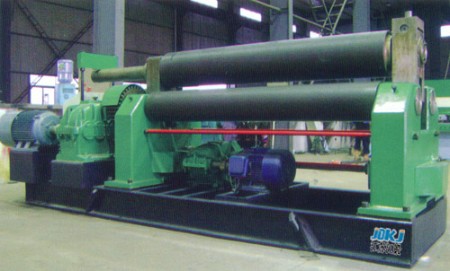本機結(jié)構(gòu)為三輥對稱式,上輥在兩下輥中央對稱位置作垂直長降運動,通過絲桿絲母蝸桿,傳動而獲得,兩下輥作旋轉(zhuǎn)運動,通過減速機的輸出齒輪與下輥齒嚙合,為卷制板材提供扭矩。
